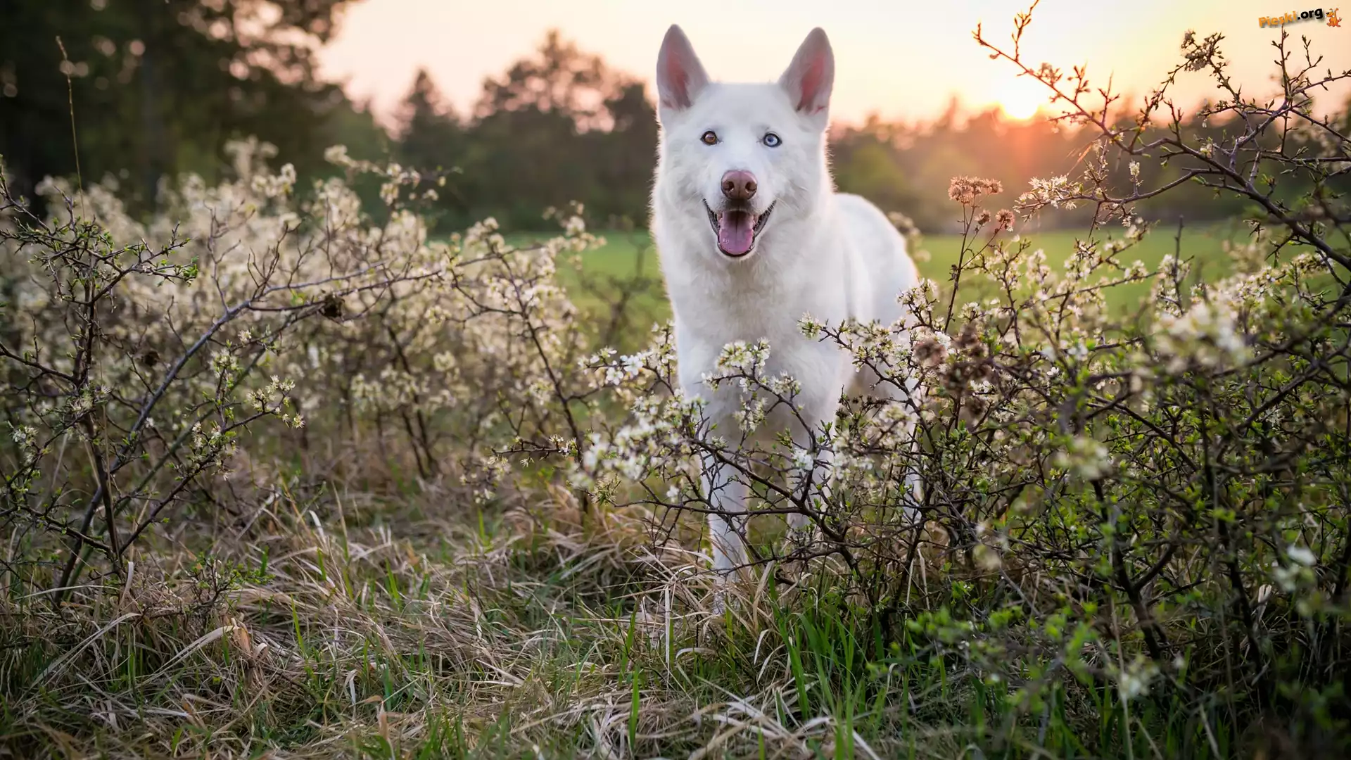 Krzewy, Biały owczarek szwajcarski, Pies, Trawa, Kwiaty, Pieski