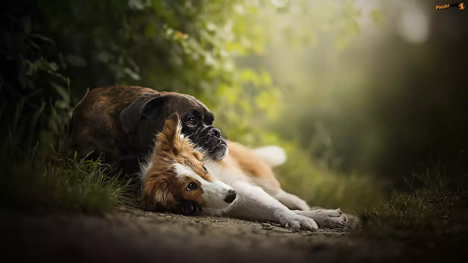 Border collie, Psy, Leżące, Bokser, Rośliny, Pieski