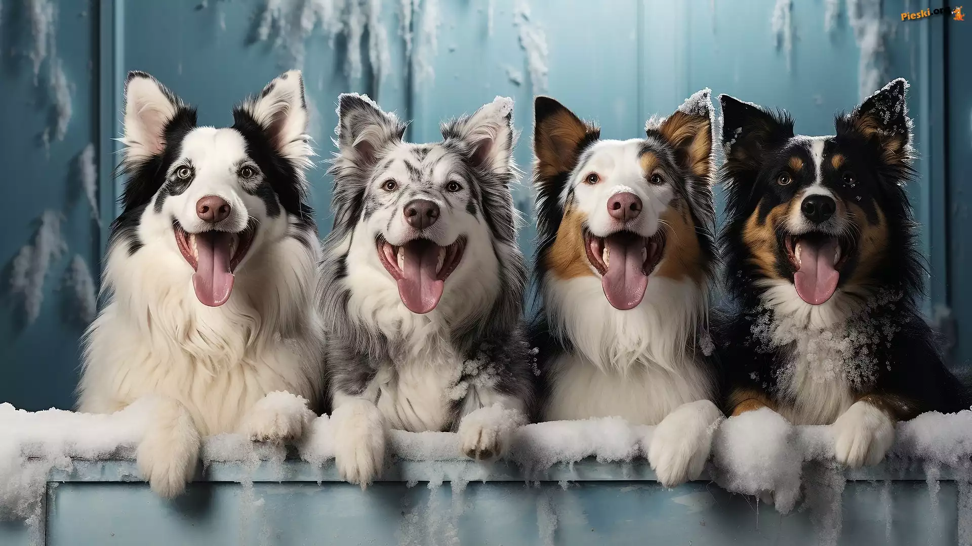 Śnieg, Psy, Border collie, Cztery, Zmarznięty, Jęzory