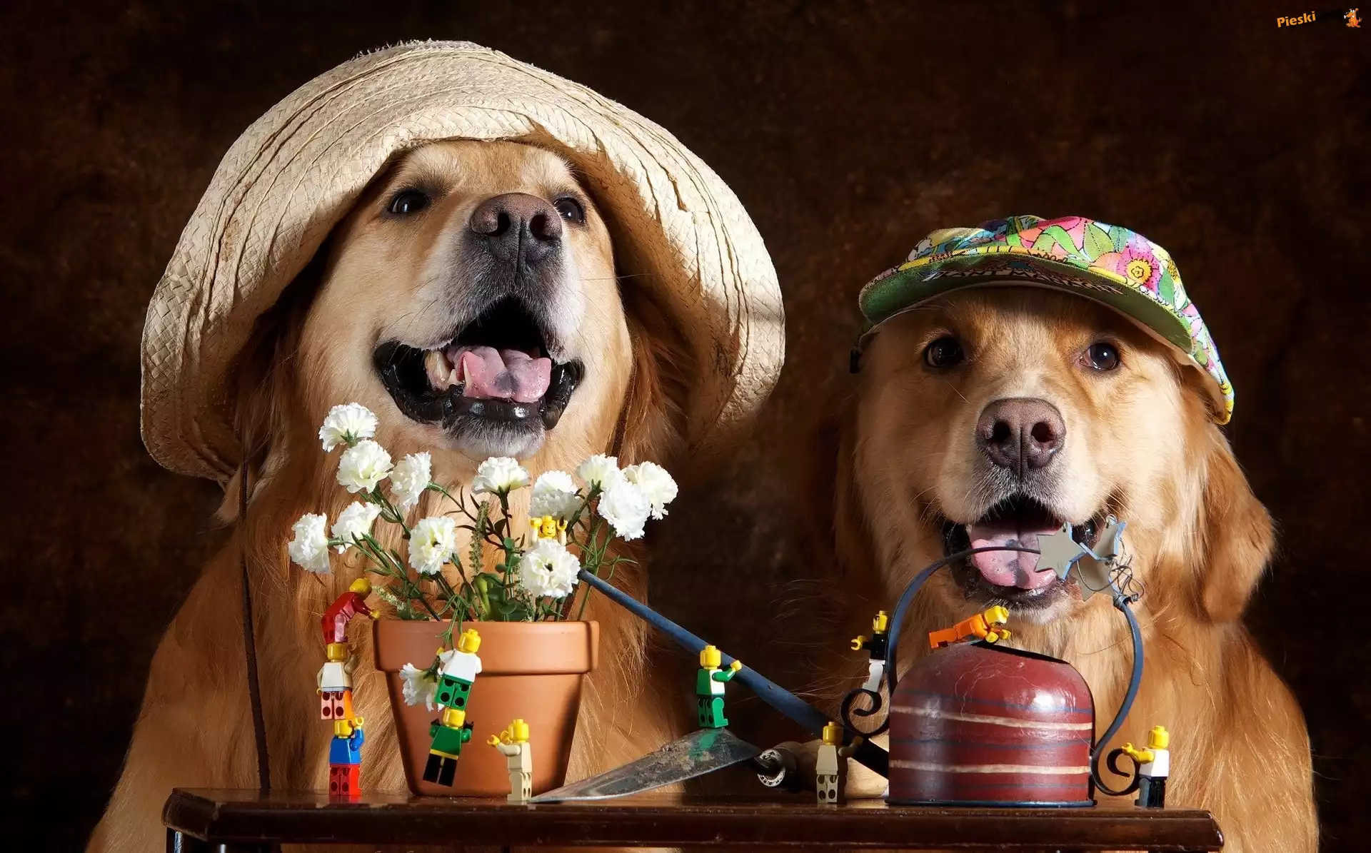 Czapki, Psy, Dwa, Golden retrievery, Kwiaty, Pieski