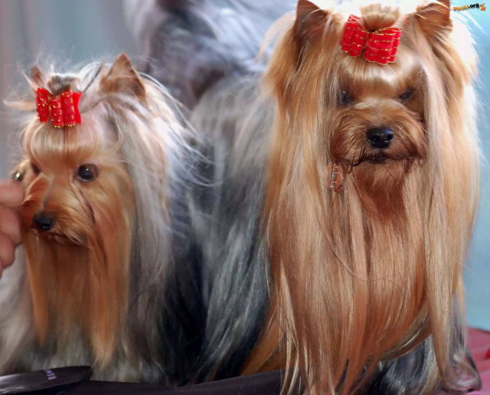 czerwone, dwa, Yorkshire Terriery, kokardki, Pieski