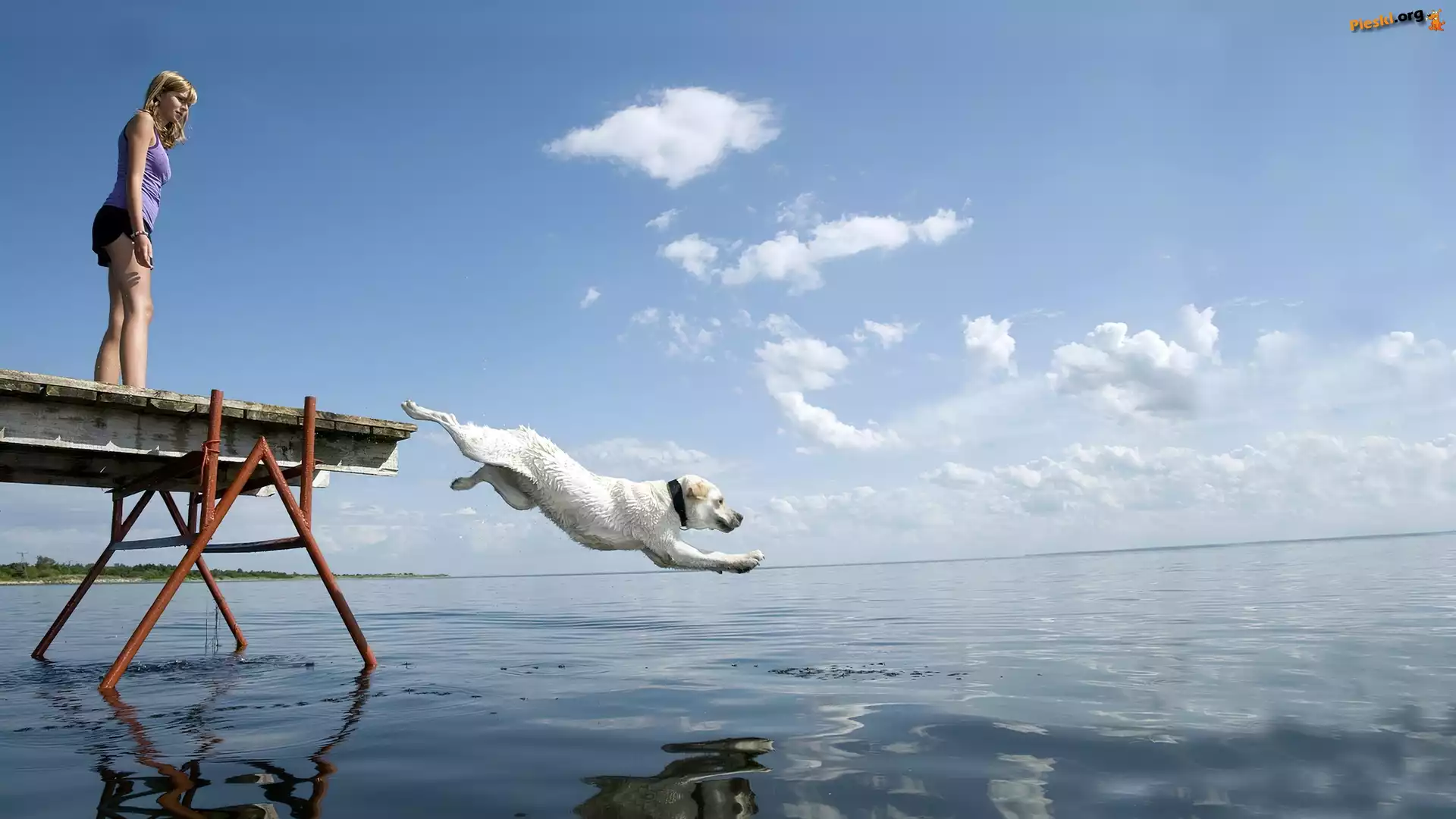 Skok, Jeziora, Kobieta, Do, Pies, Pieski