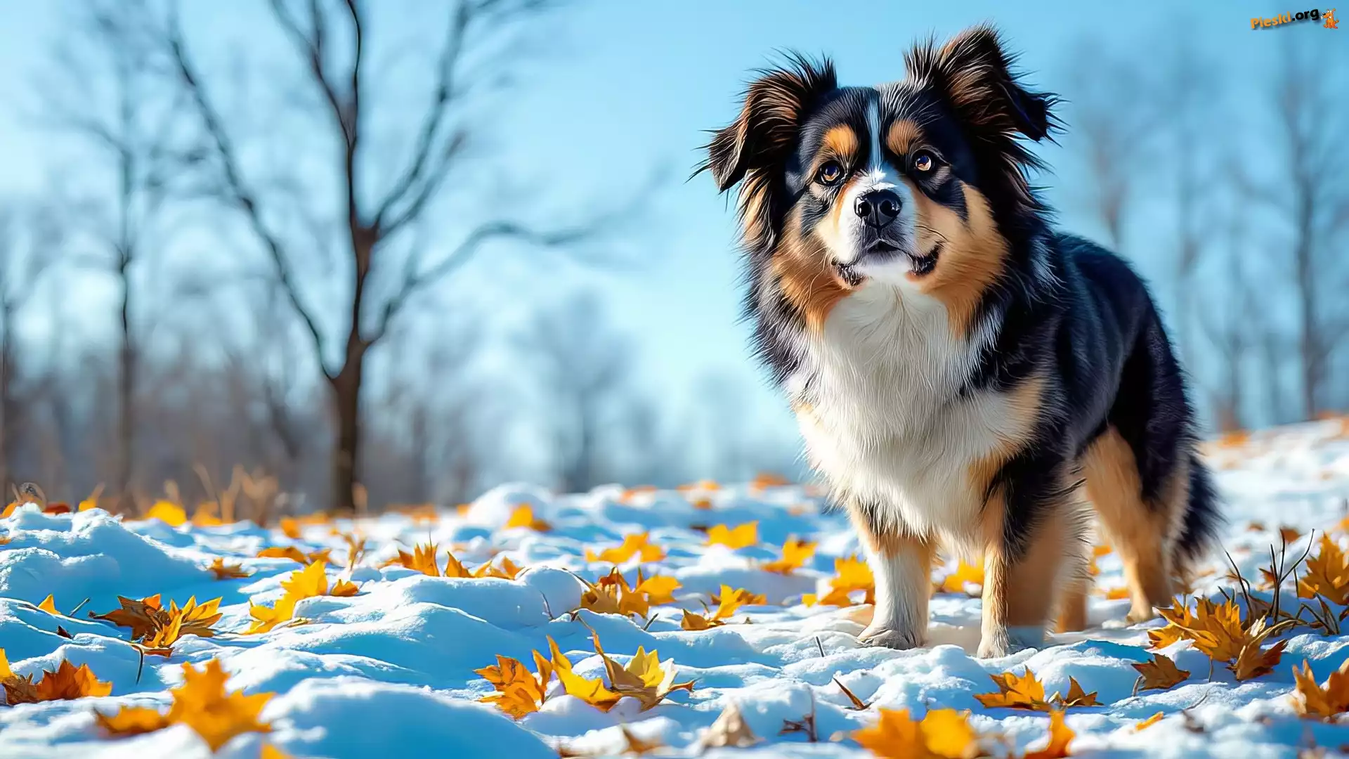 Liście, Zima, Pies, Grafika, Żółte, Śnieg, Pieski