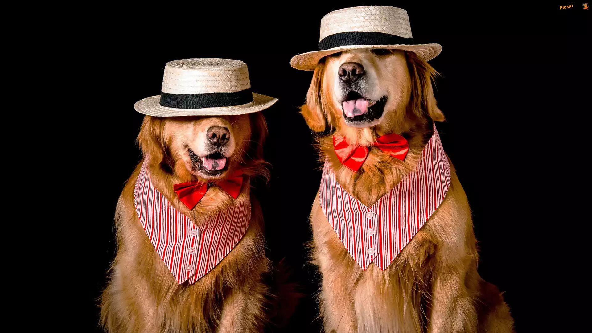 Kapelusze, Psy, Dwa, Golden retriever, Muszki, Pieski