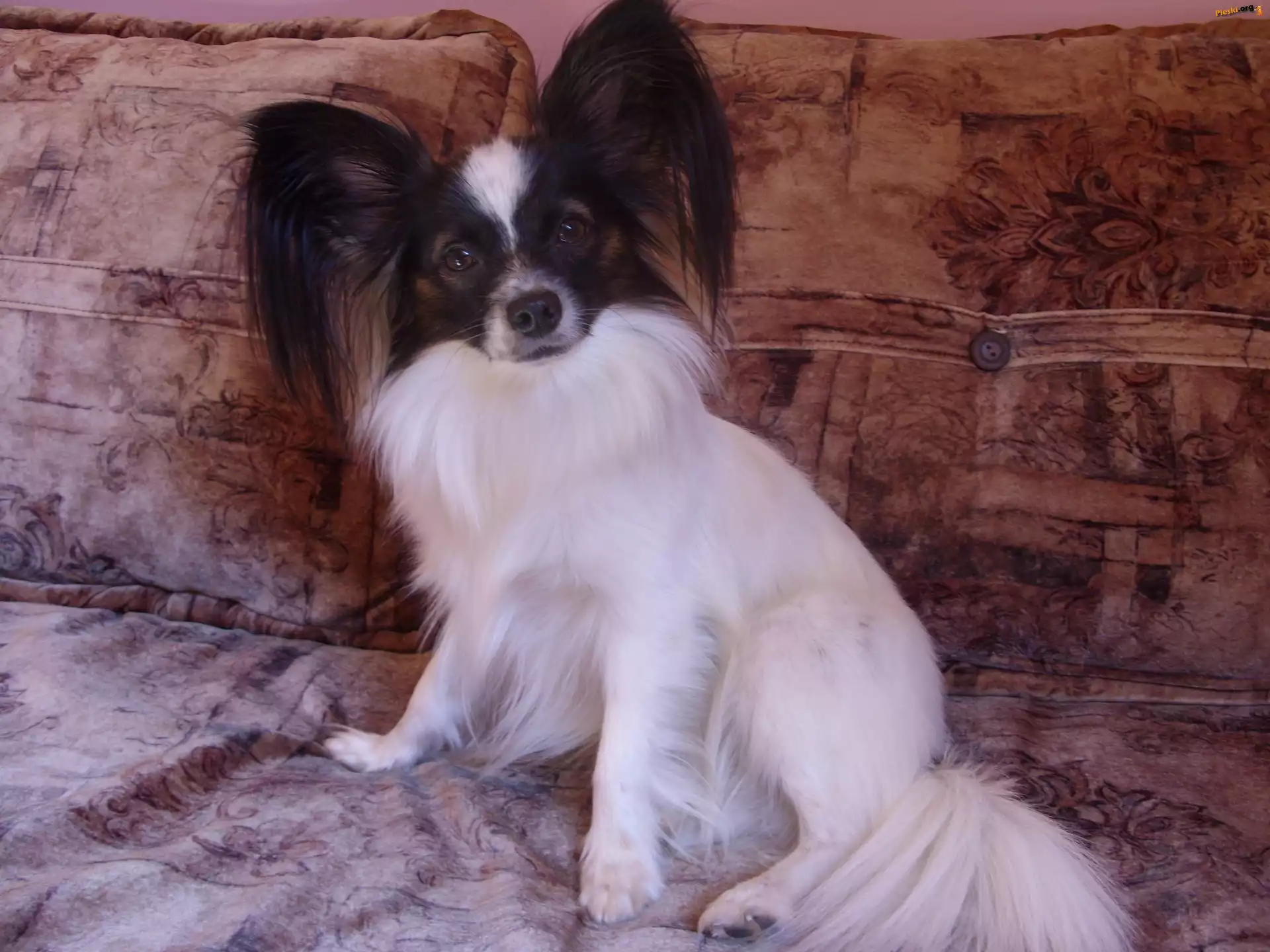 Spaniel kontynentalny miniaturowy Papillon, stojące, uszy, łóżko, Pieski