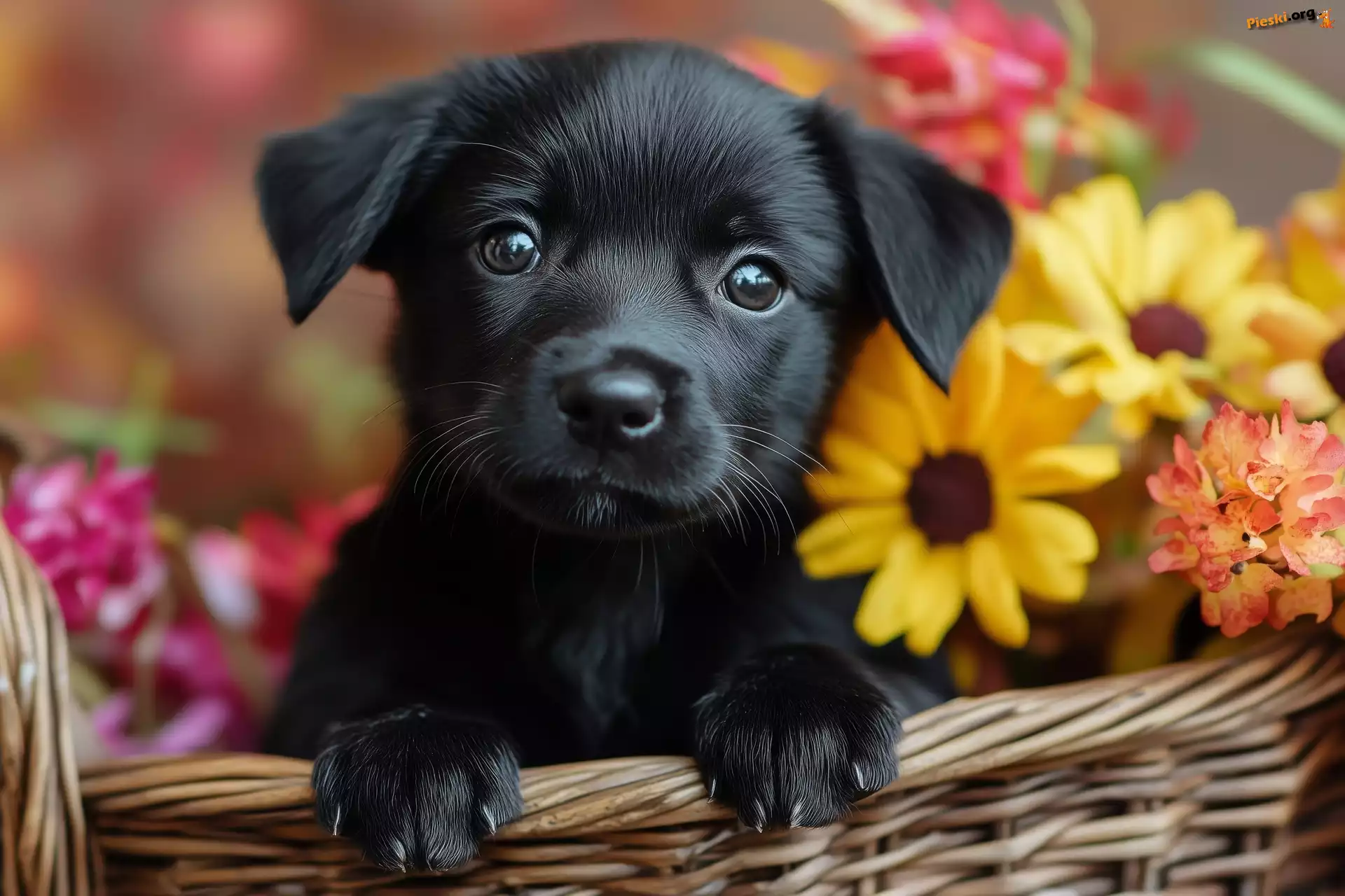 Szczeniak, Koszyk, Czarny, Kwiaty, Pies, Pieski