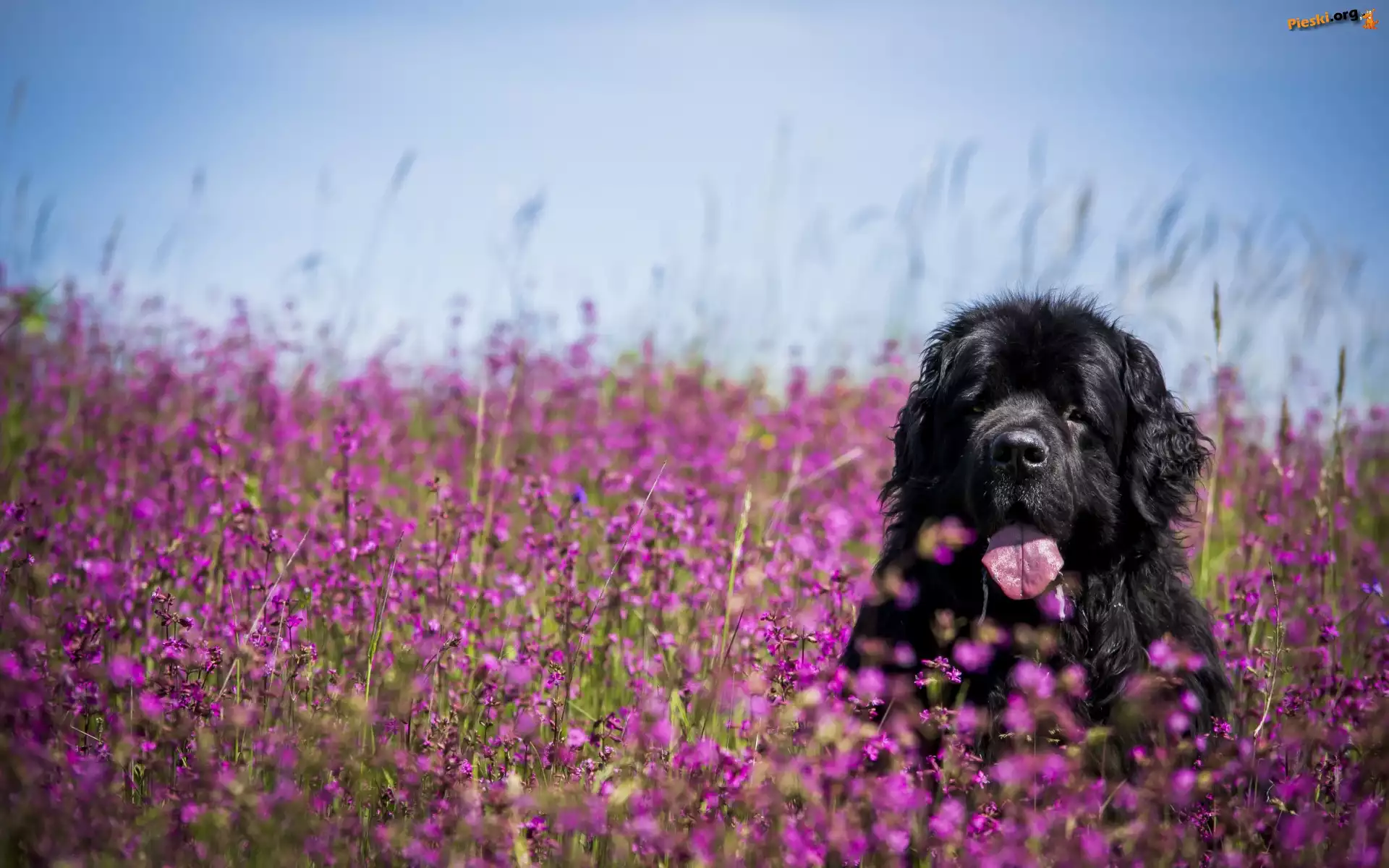 Kwiaty, Pies, Łąka, Nowofundland, Pieski