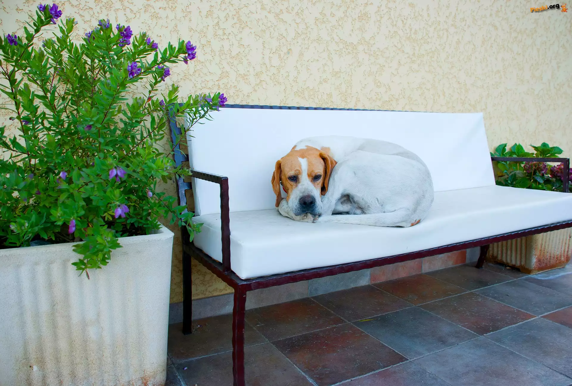 Kwiaty, Pies, Taras, Ławeczka, Pieski