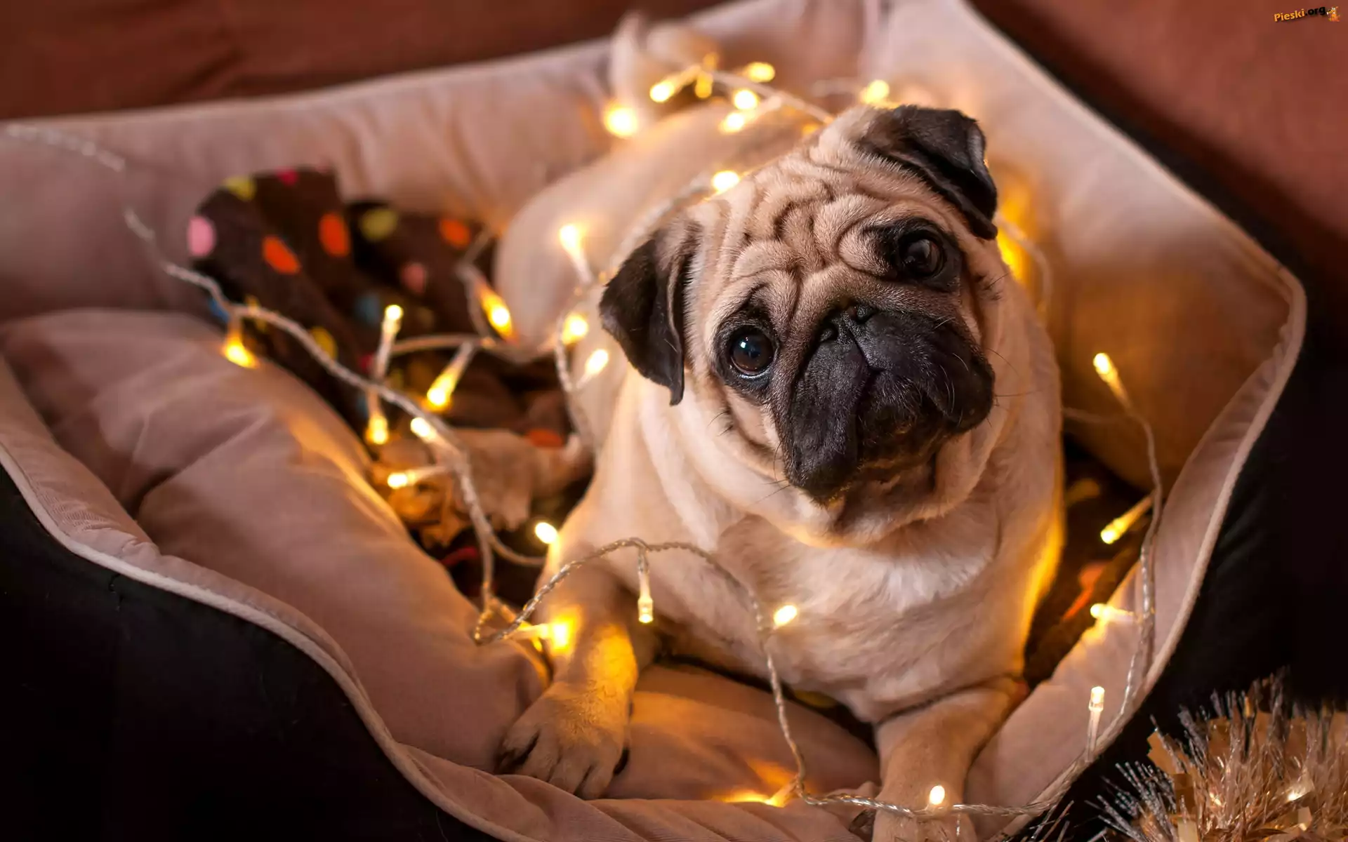 Lampki, Mops, Świąteczne, Posłanie, Pieski