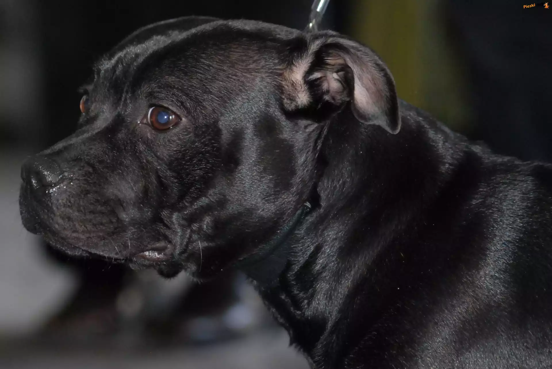Niebieski, Amerykański, Amstaff, Stafford, Terrier Trawa, Staffordshire Bull terrier, Pies Staffordshire Bull Terrier, obroża Szczeniak, Pies, Słodki, Staffordshire Bull Terrier Szczeniak, Staffordshire Bull Terrier Morda, Staffordshire Terrier Pies, Staffordshire bull terrier, Maki Mordka, Pies, Staffordshire Bull Terrier, Wrzosy morda, Staffordshire Bull Terrier