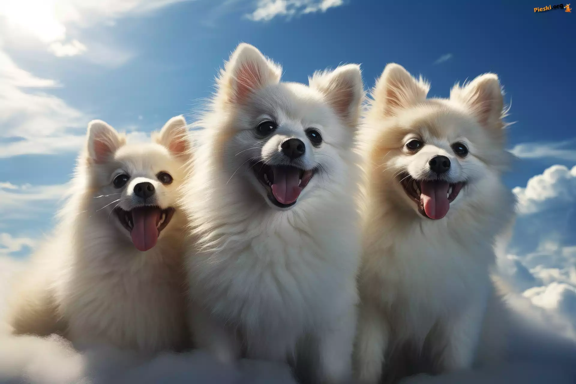 Grafika, Białe, Psy, Chmury, Trzy, Szpice miniaturowe, Niebo, Pieski