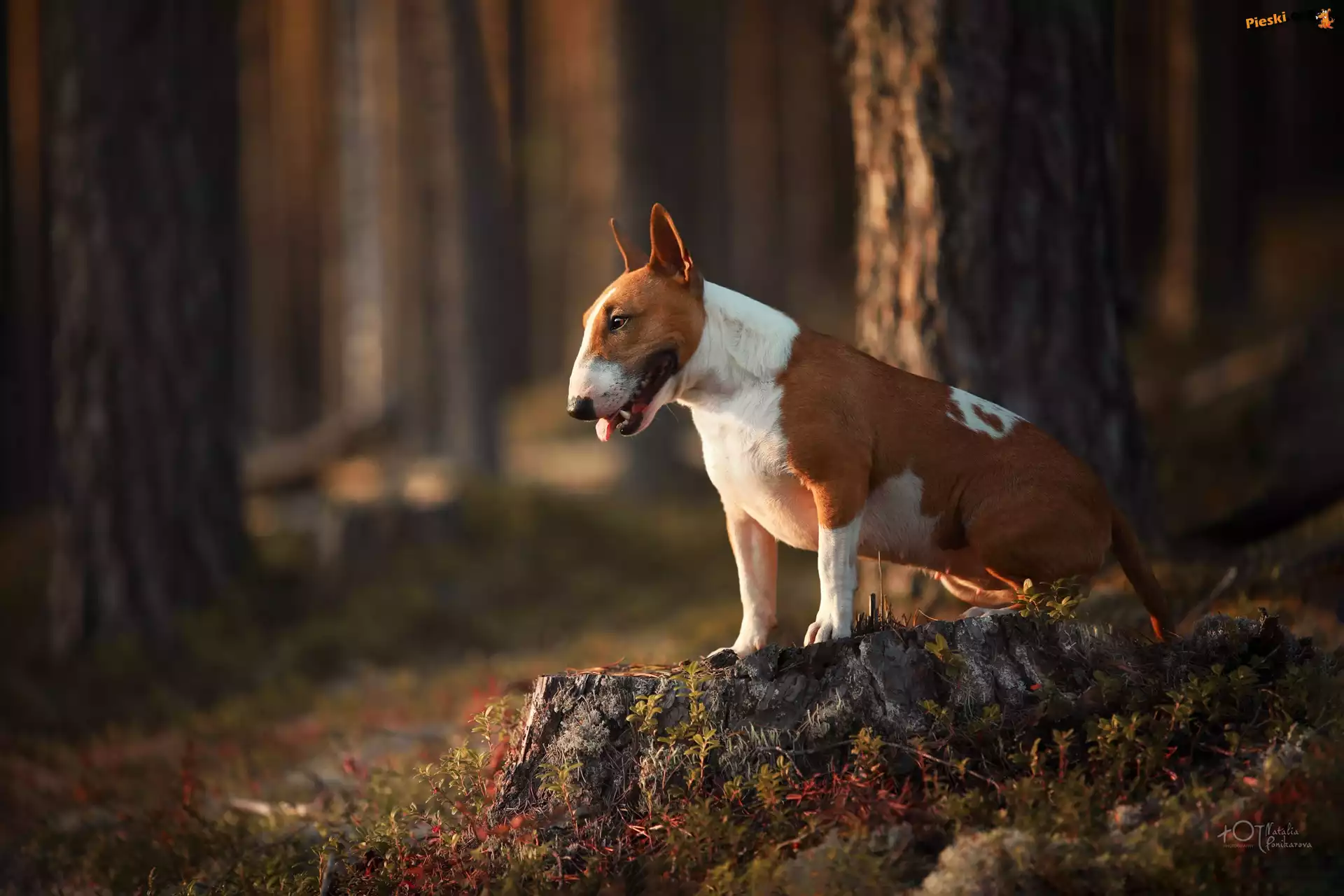 Ściółka, Bulterier, Pies, Pień, Las, Pieski