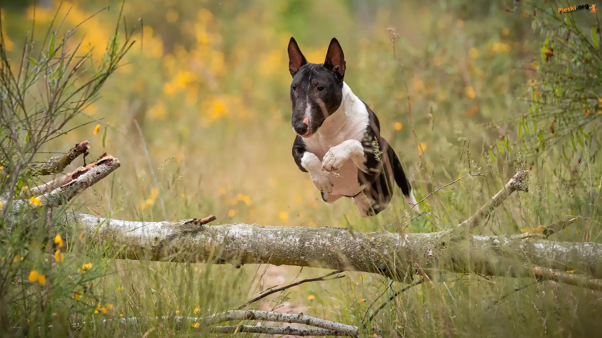Pień, Bulterier, Pies, Skok, Kłoda, Pieski