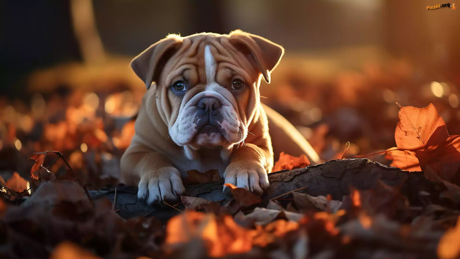 Liście, Buldog angielski, Pies, Pieski