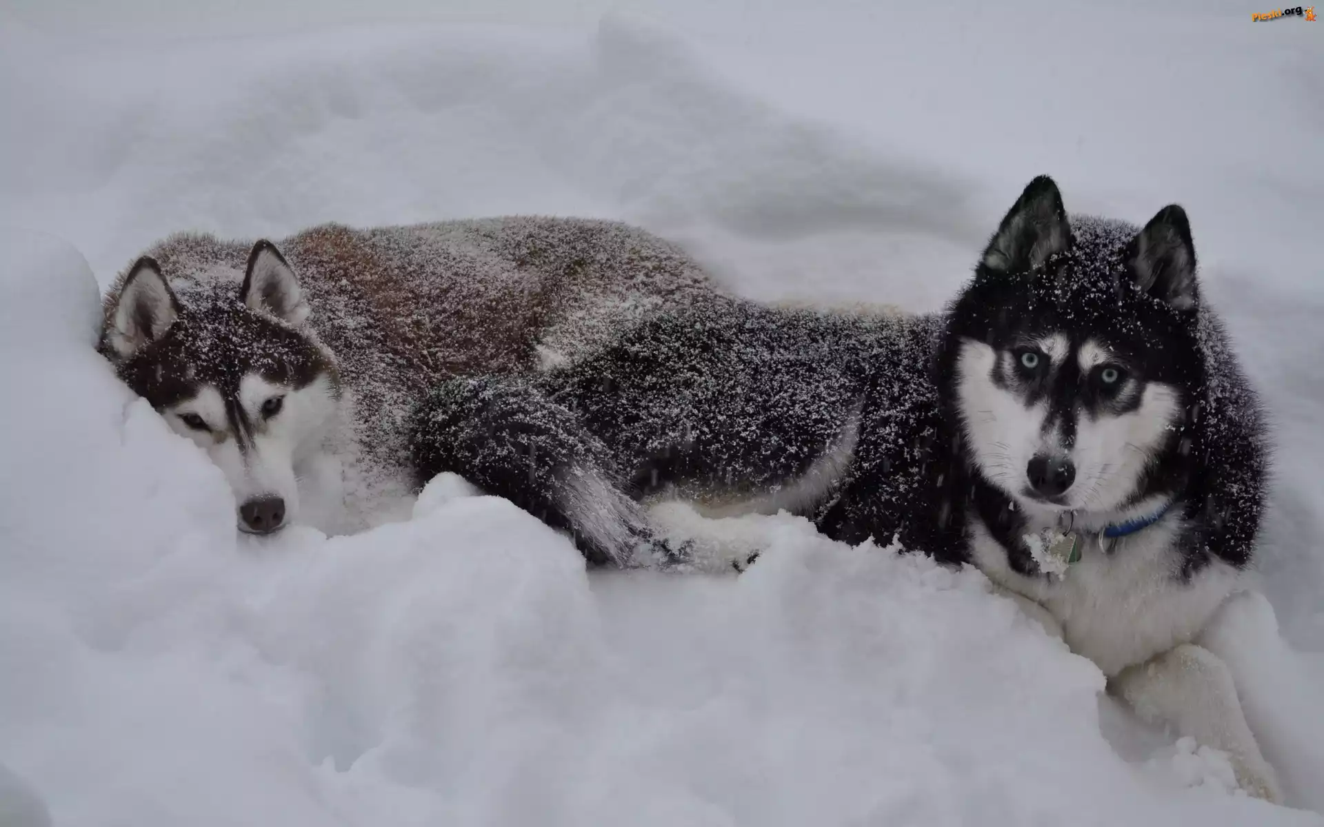 Śnieg, Siberian Husky, Psy, Zima, Pieski
