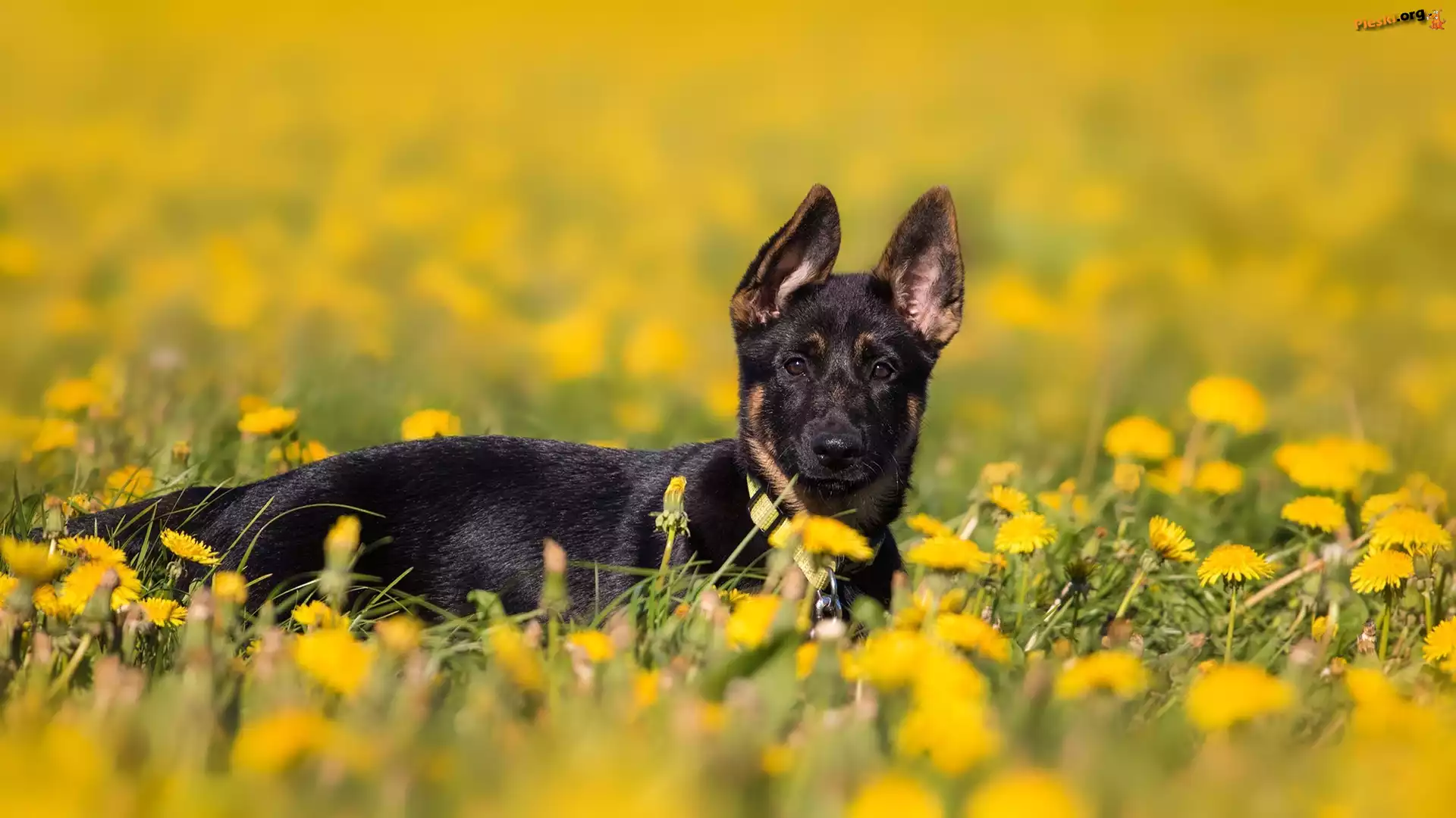 Szczeniak, Rozmyte, Mniszek pospolity, Owczarek niemiecki, Łąka, Tło