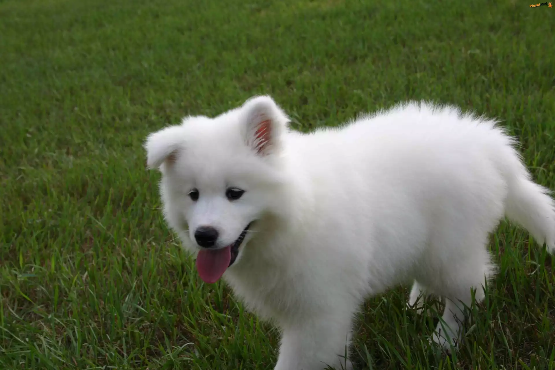 Samojed, trawa, Pieski