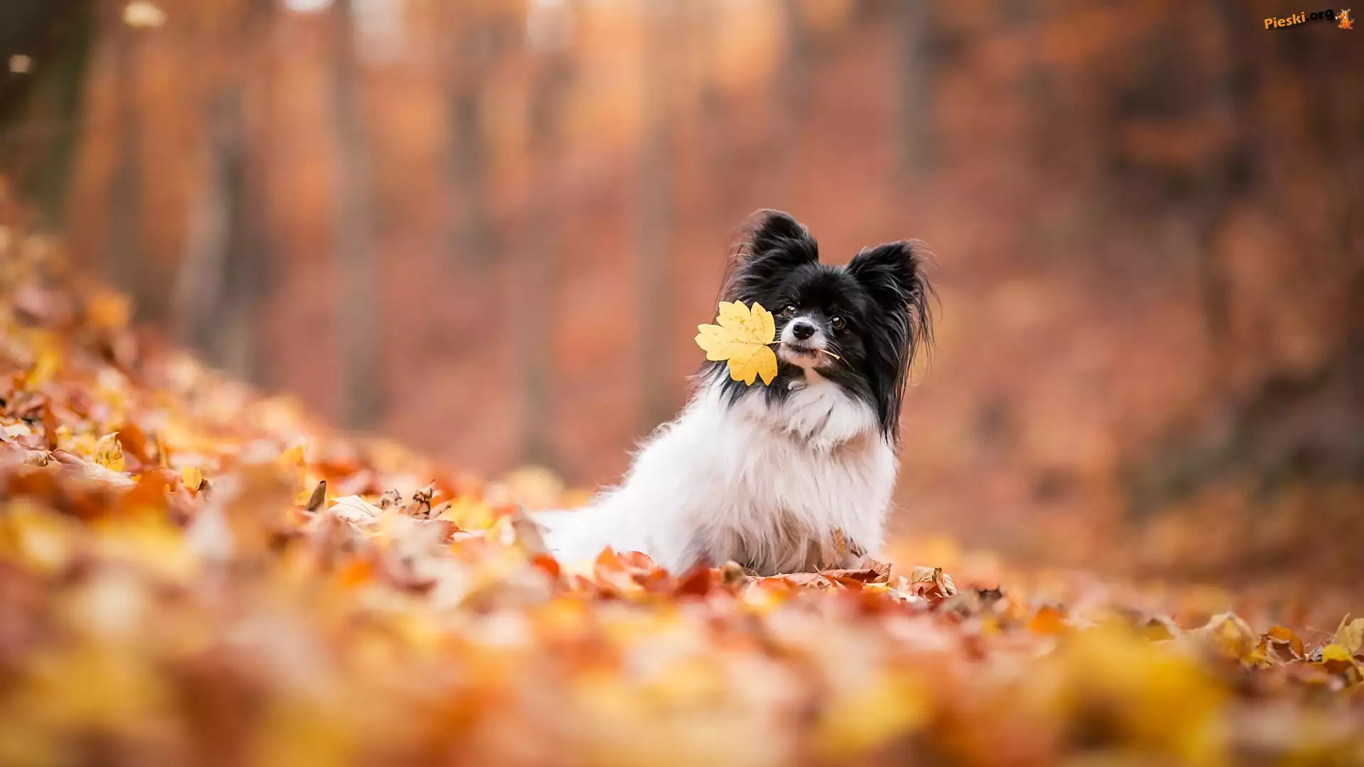 Rozmyte, Spaniel kontynentalny miniaturowy Papillon, Pies, Liście, Tło