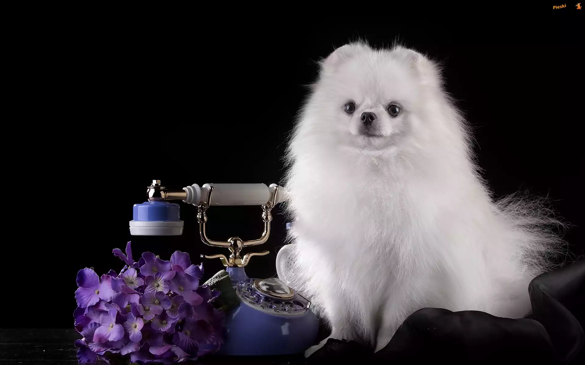 Telefon, Biały, Szpic, Hortensje, Pieski