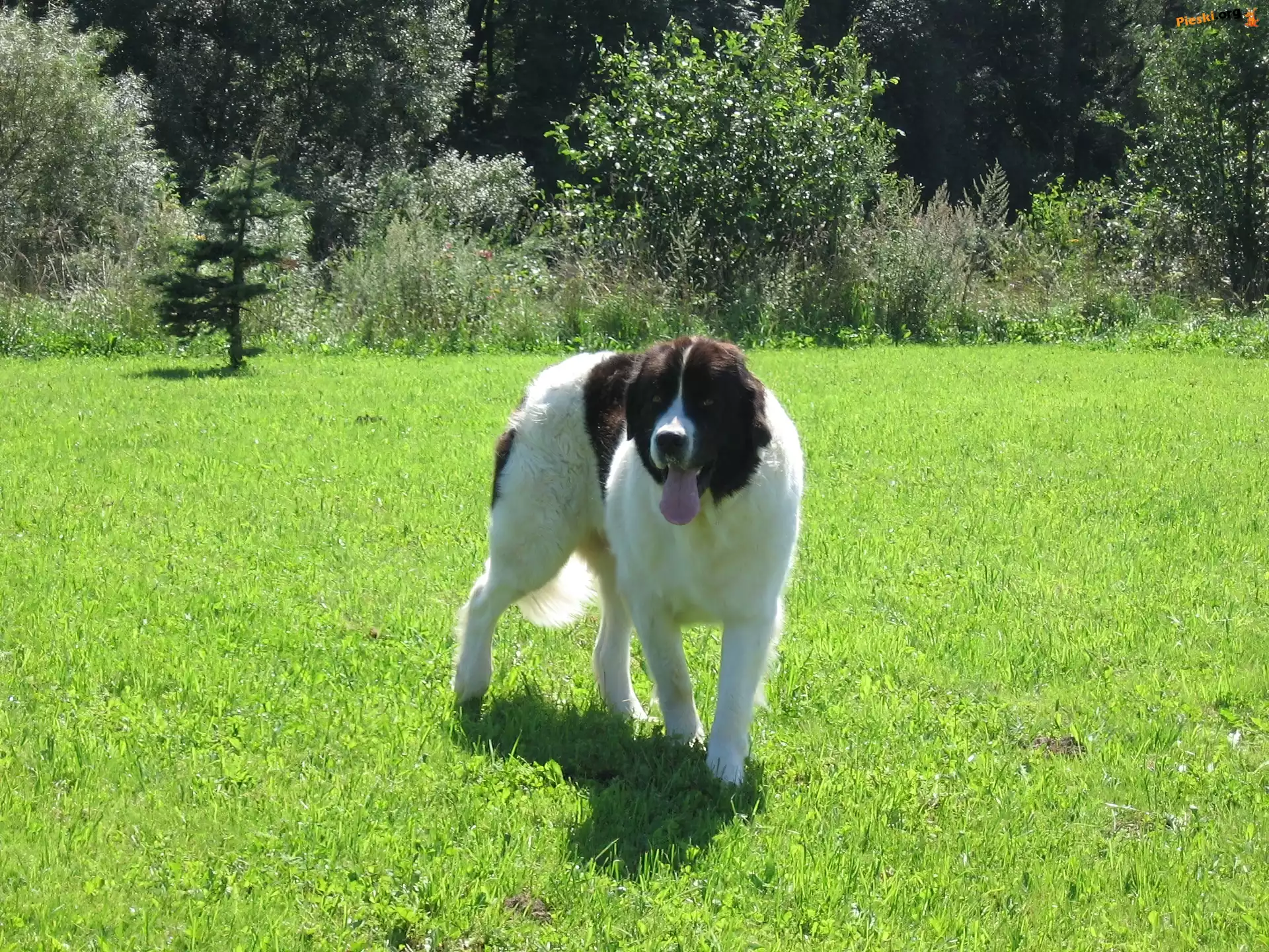 słodkie, szczeniaki, Landseery biegnący, Landseer Morda, Landseera trawa, zielona, Landseer trzy, Landseery biało-czarny, Landseer mordka, Landseera kratka, chustki, Landseer pysk, Landseera Kot, Pies, Słodkie morda, Landseera Piesek, Łąka